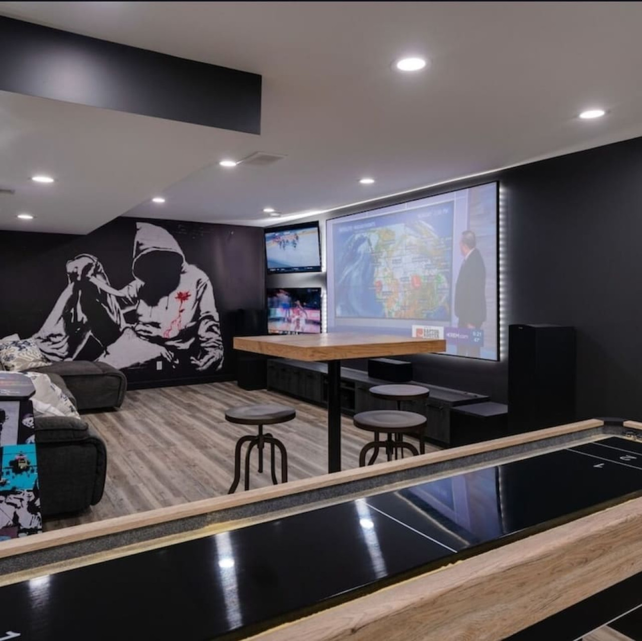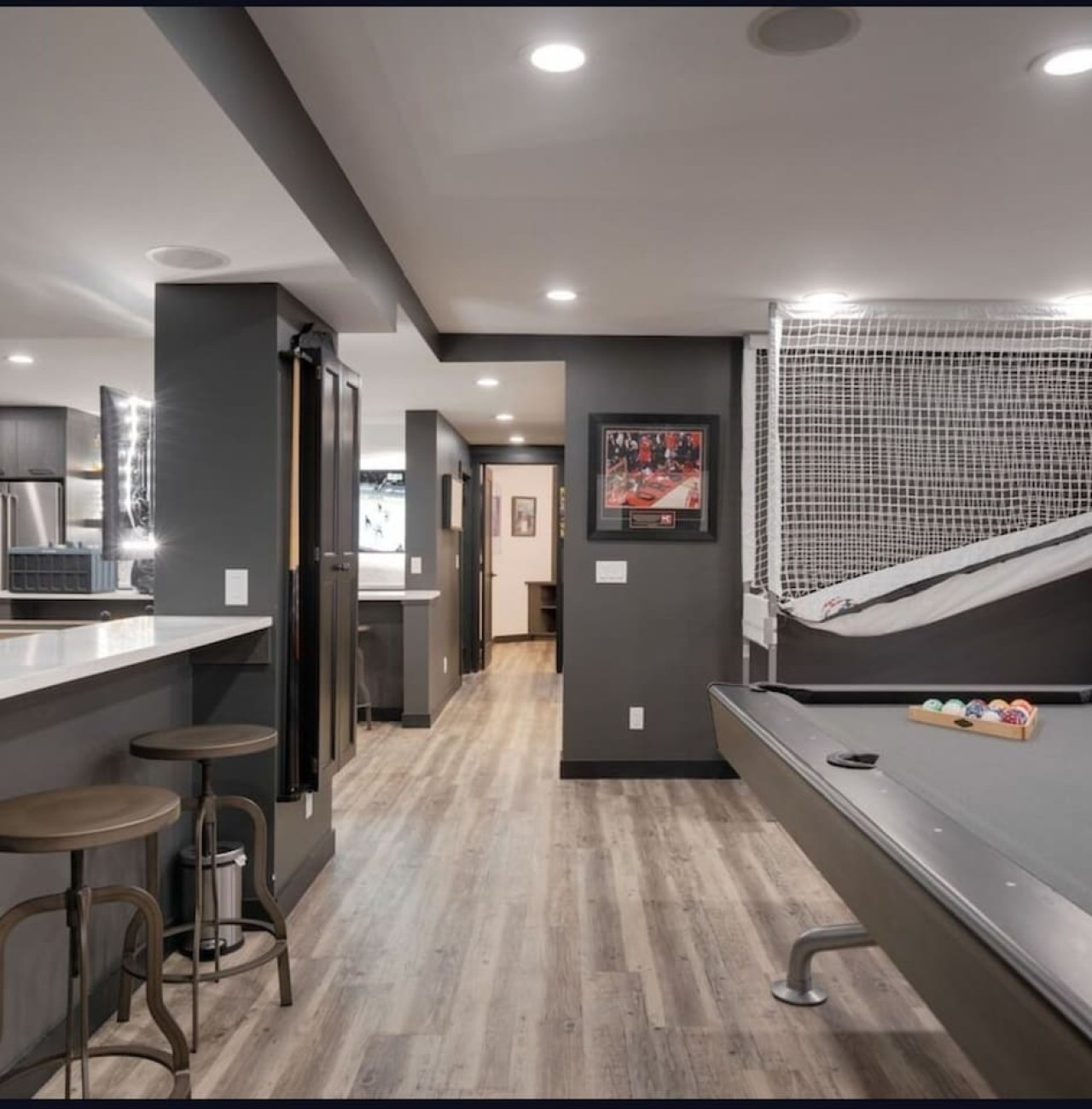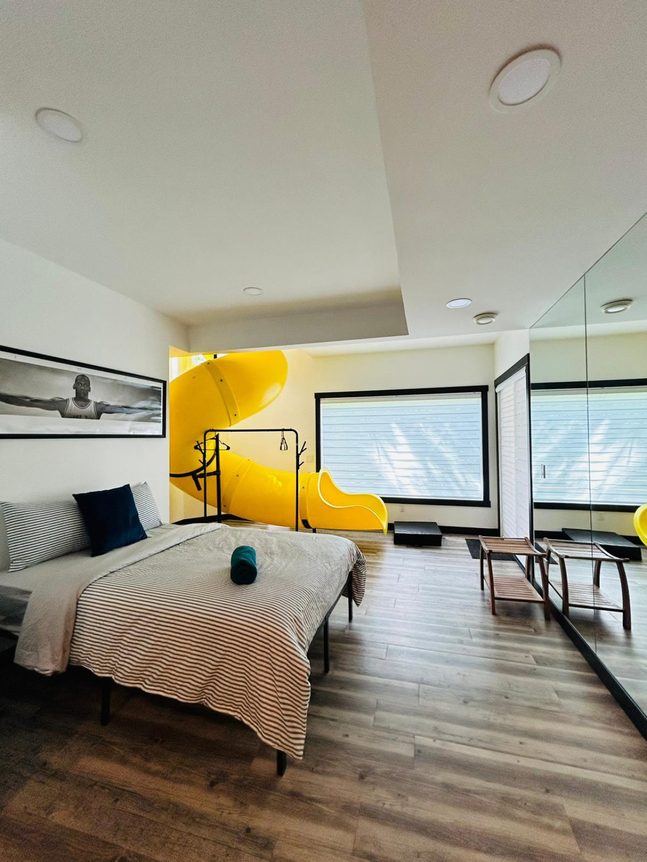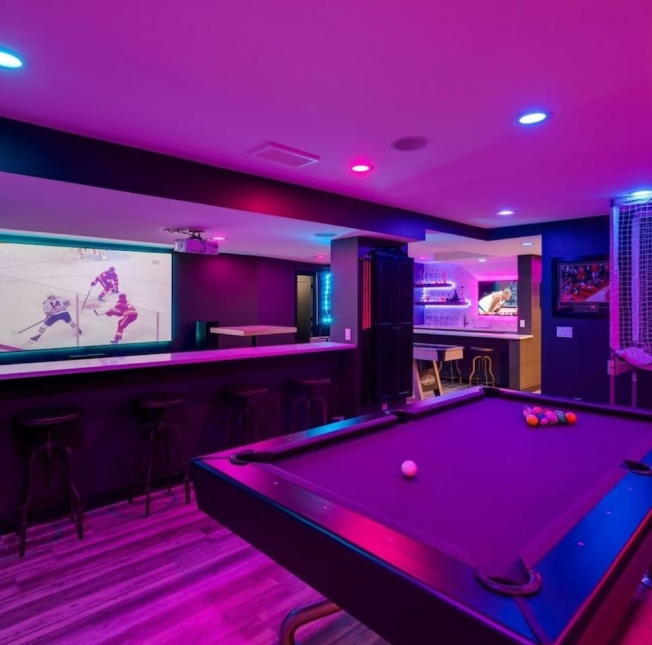 / nightThe Reimagine Calgary South is the perfect destination for your family or mid-large size group. The 5500sf home backs onto the Eagle Quest public golf course and has been lovingly renovated from the studs over the past 4 years. The house is perfect for entertaining, with tons of seating dual bars in the basement, colour changing lighting and 9 tvs. Great location and easy access to all that Calgary has to offer! - 5500 sf developed - 8 Bedroom (6 natural bedrooms, plus lower gym and office where we have added beds) - 4 Full Bathrooms + 1 Half Bathroom - Kitchen: Chef’s Kitchen with high-end appliances, walk-in pantry and large central island. - Dual Gas Fireplaces - Upper and Lower Private Decks - 5-Piece Master Ensuite featuring massive steam shower with 48”x48” rain head and 72” jetted soaker tub. - 1600sf Basement w/ Dual Bars, Tons of Seating and Plenty of Games for you to enjoy. Also offers Phillips Hues colour changing lighting to set the mood however you want it. What's Fun?? - Slide from Main Floor To Basement (lands in 8th bedroom, so someone might not love it if you are using all the rooms). - Shuffleboard - 9 TVs, Including 4 in the basement entertaining area. - Pop-A-Shot - Pool Table - Secret Door - Indoor-Trampoline (KIDS ONLY) - 8’ Indoor Climbing Wall (KIDS ONLY) NEGATIVES - Garage Not Included In Rental (We use it for storage). There are three stalls on the driveway. Beyond that there is very limited street parking. (PLEASE BE CONSIDERATE OF THE NEIGHBOURS AS WE HAVE HAD ISSUES WITH GUESTS BLOCKING NEIGHBOURS DRIVEWAYS). - Yard is not fenced on two sides. - No shedding dogs please as our kids have allergies. And there is a super cool slide from the kitchen to the basement.