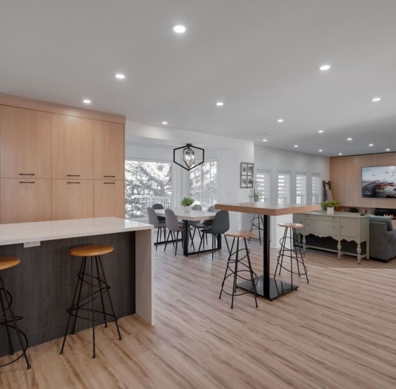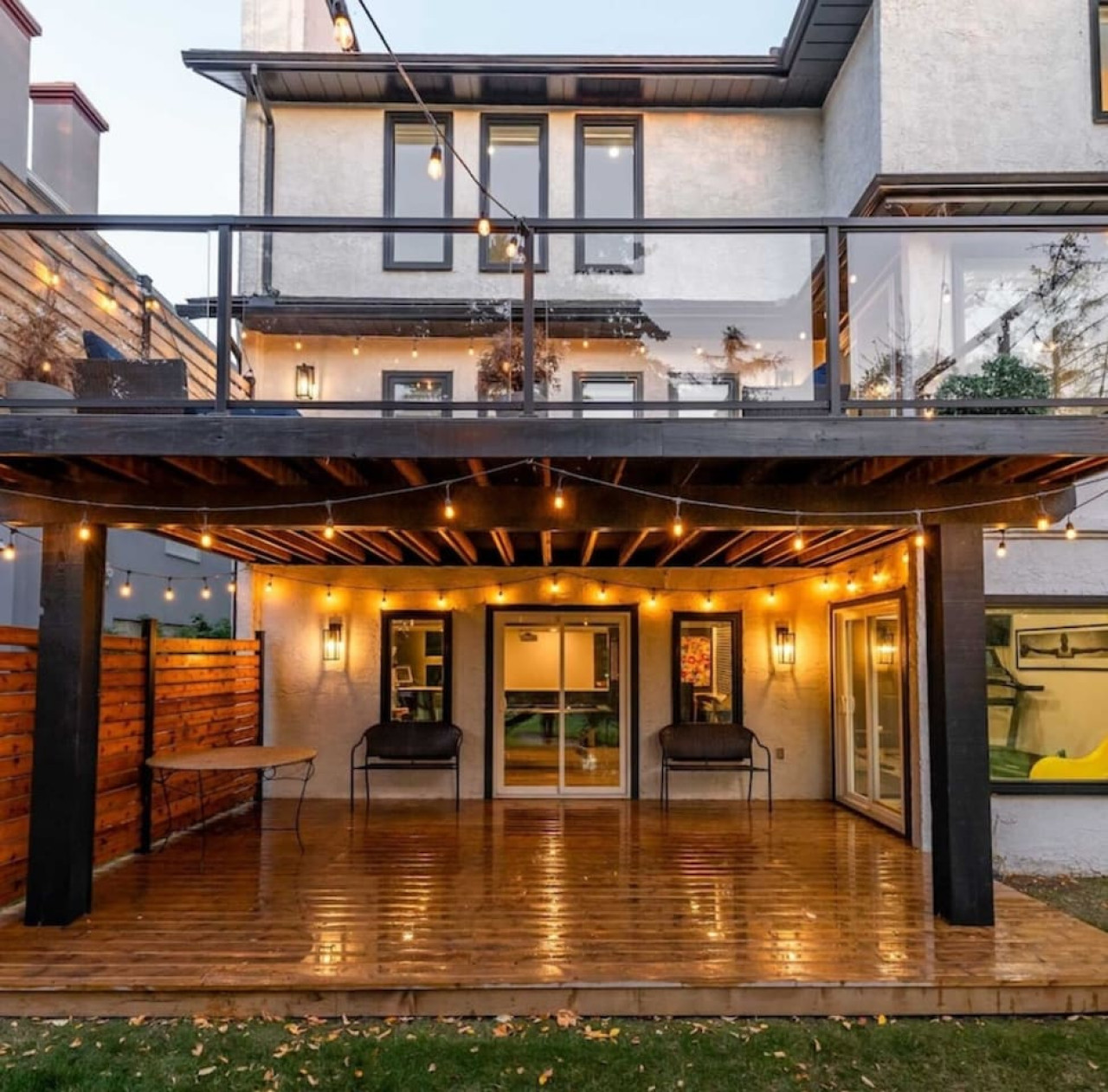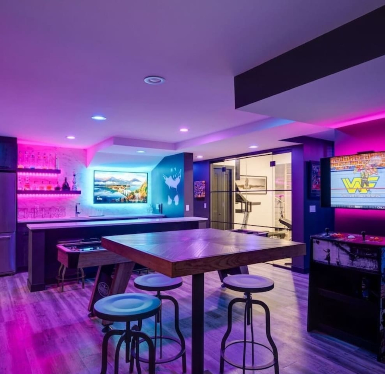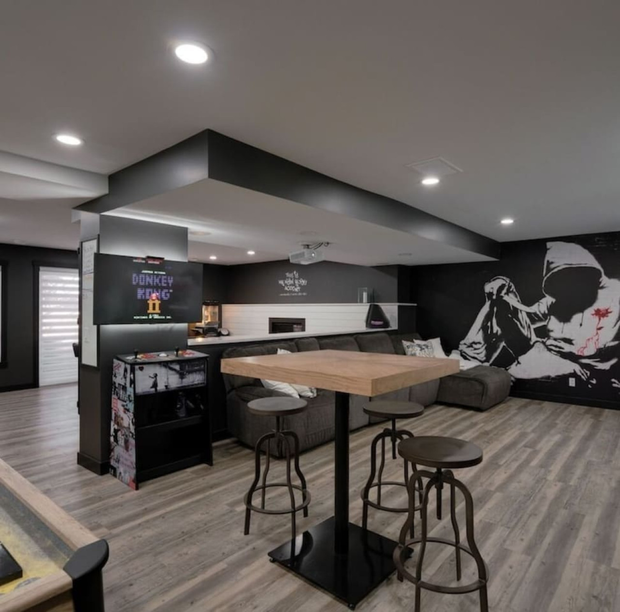 / nightThe Reimagine Calgary South is the perfect destination for your family or mid-large size group. The 5500sf home backs onto the Eagle Quest public golf course and has been lovingly renovated from the studs over the past 4 years. The house is perfect for entertaining, with tons of seating dual bars in the basement, colour changing lighting and 9 tvs. Great location and easy access to all that Calgary has to offer! - 5500 sf developed - 8 Bedroom (6 natural bedrooms, plus lower gym and office where we have added beds) - 4 Full Bathrooms + 1 Half Bathroom - Kitchen: Chef’s Kitchen with high-end appliances, walk-in pantry and large central island. - Dual Gas Fireplaces - Upper and Lower Private Decks - 5-Piece Master Ensuite featuring massive steam shower with 48”x48” rain head and 72” jetted soaker tub. - 1600sf Basement w/ Dual Bars, Tons of Seating and Plenty of Games for you to enjoy. Also offers Phillips Hues colour changing lighting to set the mood however you want it. What's Fun?? - Slide from Main Floor To Basement (lands in 8th bedroom, so someone might not love it if you are using all the rooms). - Shuffleboard - 9 TVs, Including 4 in the basement entertaining area. - Pop-A-Shot - Pool Table - Secret Door - Indoor-Trampoline (KIDS ONLY) - 8’ Indoor Climbing Wall (KIDS ONLY) NEGATIVES - Garage Not Included In Rental (We use it for storage). There are three stalls on the driveway. Beyond that there is very limited street parking. (PLEASE BE CONSIDERATE OF THE NEIGHBOURS AS WE HAVE HAD ISSUES WITH GUESTS BLOCKING NEIGHBOURS DRIVEWAYS). - Yard is not fenced on two sides. - No shedding dogs please as our kids have allergies. And there is a super cool slide from the kitchen to the basement.