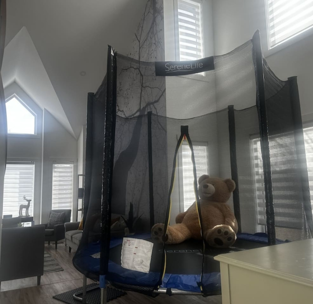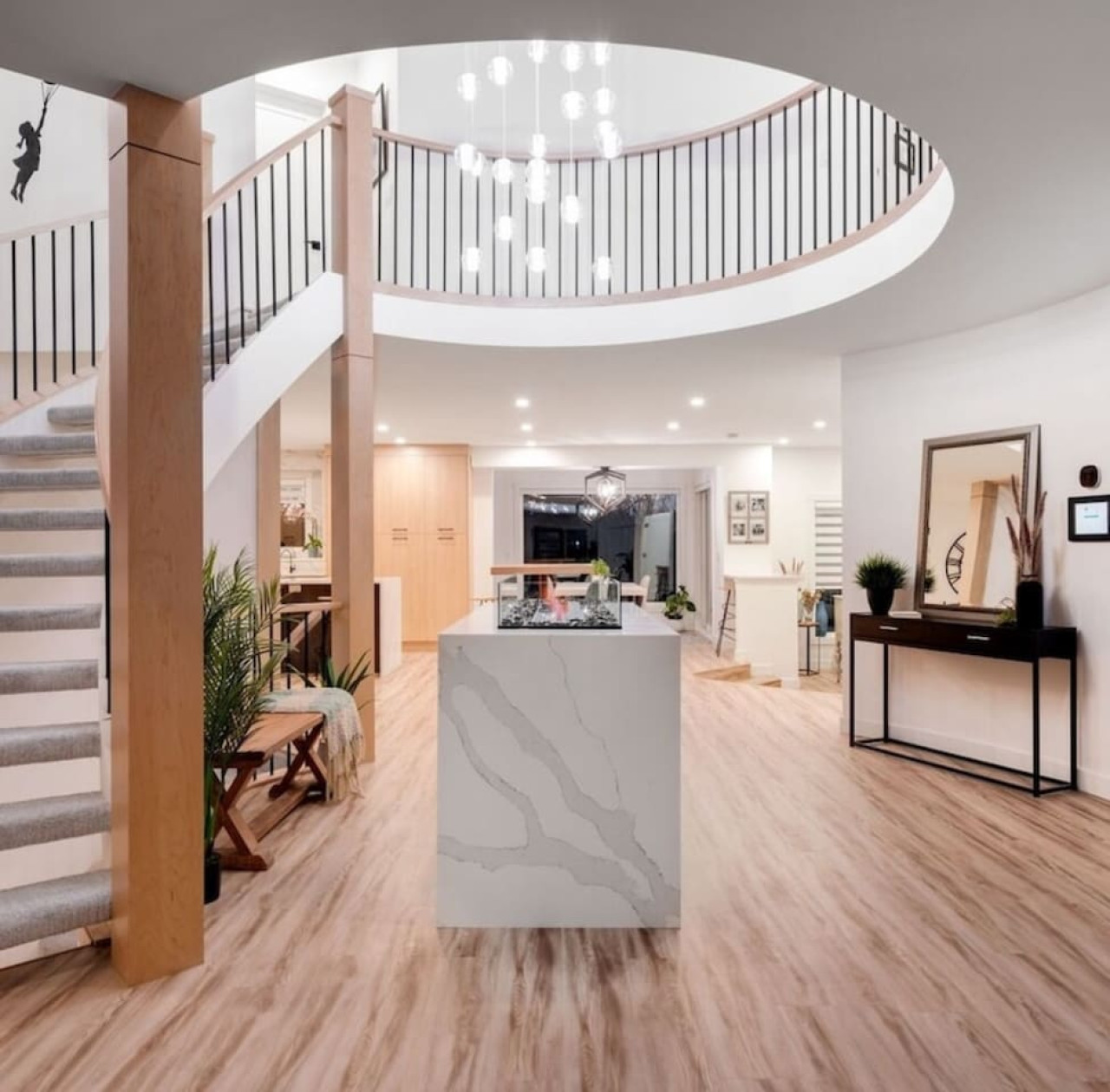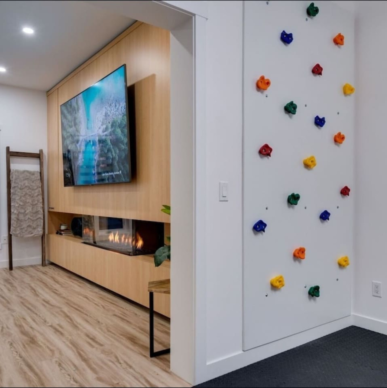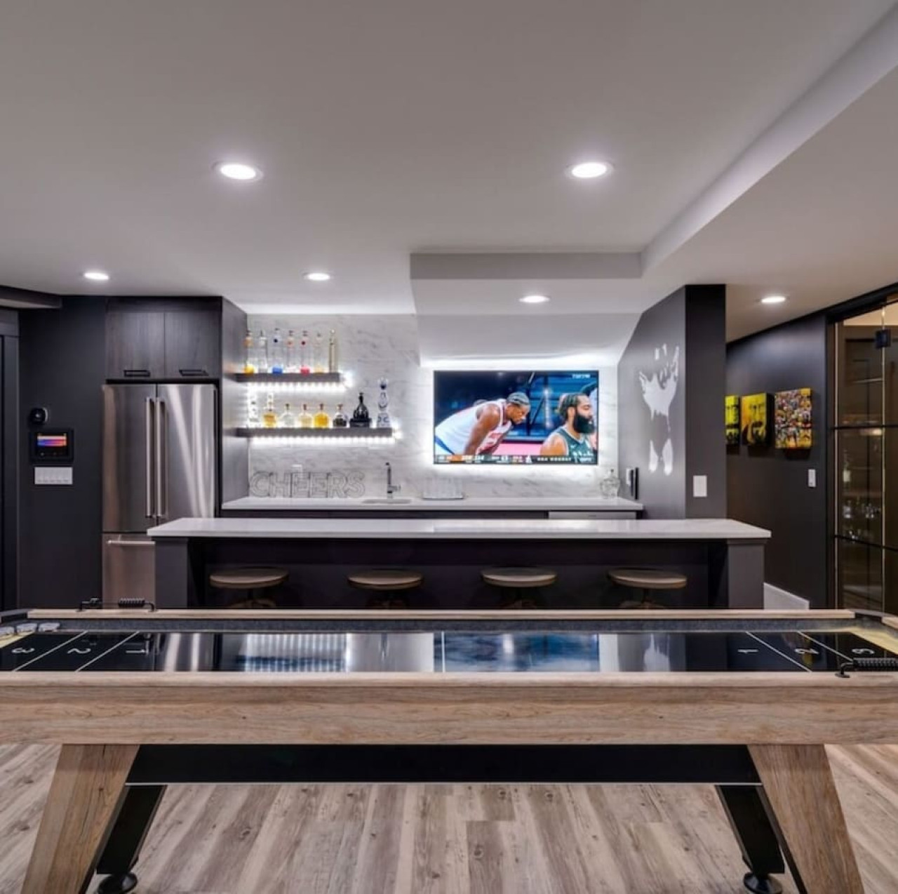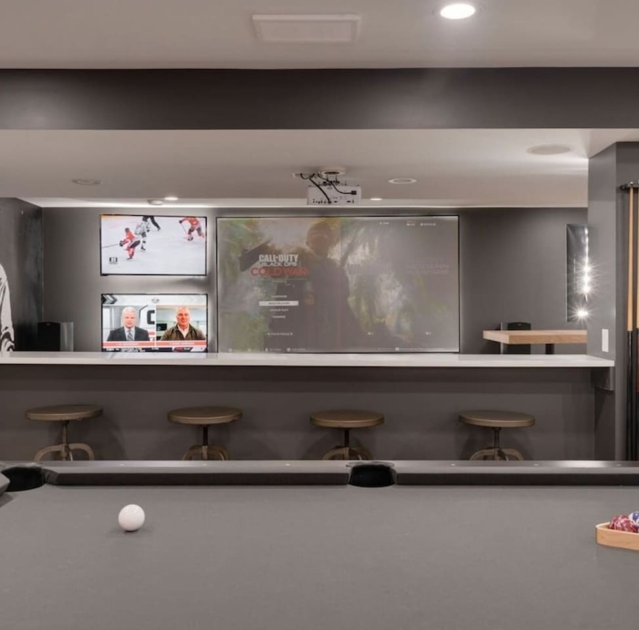 / nightThe Reimagine Calgary South is the perfect destination for your family or mid-large size group. The 5500sf home backs onto the Eagle Quest public golf course and has been lovingly renovated from the studs over the past 4 years. The house is perfect for entertaining, with tons of seating dual bars in the basement, colour changing lighting and 9 tvs. Great location and easy access to all that Calgary has to offer! - 5500 sf developed - 8 Bedroom (6 natural bedrooms, plus lower gym and office where we have added beds) - 4 Full Bathrooms + 1 Half Bathroom - Kitchen: Chef’s Kitchen with high-end appliances, walk-in pantry and large central island. - Dual Gas Fireplaces - Upper and Lower Private Decks - 5-Piece Master Ensuite featuring massive steam shower with 48”x48” rain head and 72” jetted soaker tub. - 1600sf Basement w/ Dual Bars, Tons of Seating and Plenty of Games for you to enjoy. Also offers Phillips Hues colour changing lighting to set the mood however you want it. What's Fun?? - Slide from Main Floor To Basement (lands in 8th bedroom, so someone might not love it if you are using all the rooms). - Shuffleboard - 9 TVs, Including 4 in the basement entertaining area. - Pop-A-Shot - Pool Table - Secret Door - Indoor-Trampoline (KIDS ONLY) - 8’ Indoor Climbing Wall (KIDS ONLY) NEGATIVES - Garage Not Included In Rental (We use it for storage). There are three stalls on the driveway. Beyond that there is very limited street parking. (PLEASE BE CONSIDERATE OF THE NEIGHBOURS AS WE HAVE HAD ISSUES WITH GUESTS BLOCKING NEIGHBOURS DRIVEWAYS). - Yard is not fenced on two sides. - No shedding dogs please as our kids have allergies. And there is a super cool slide from the kitchen to the basement.